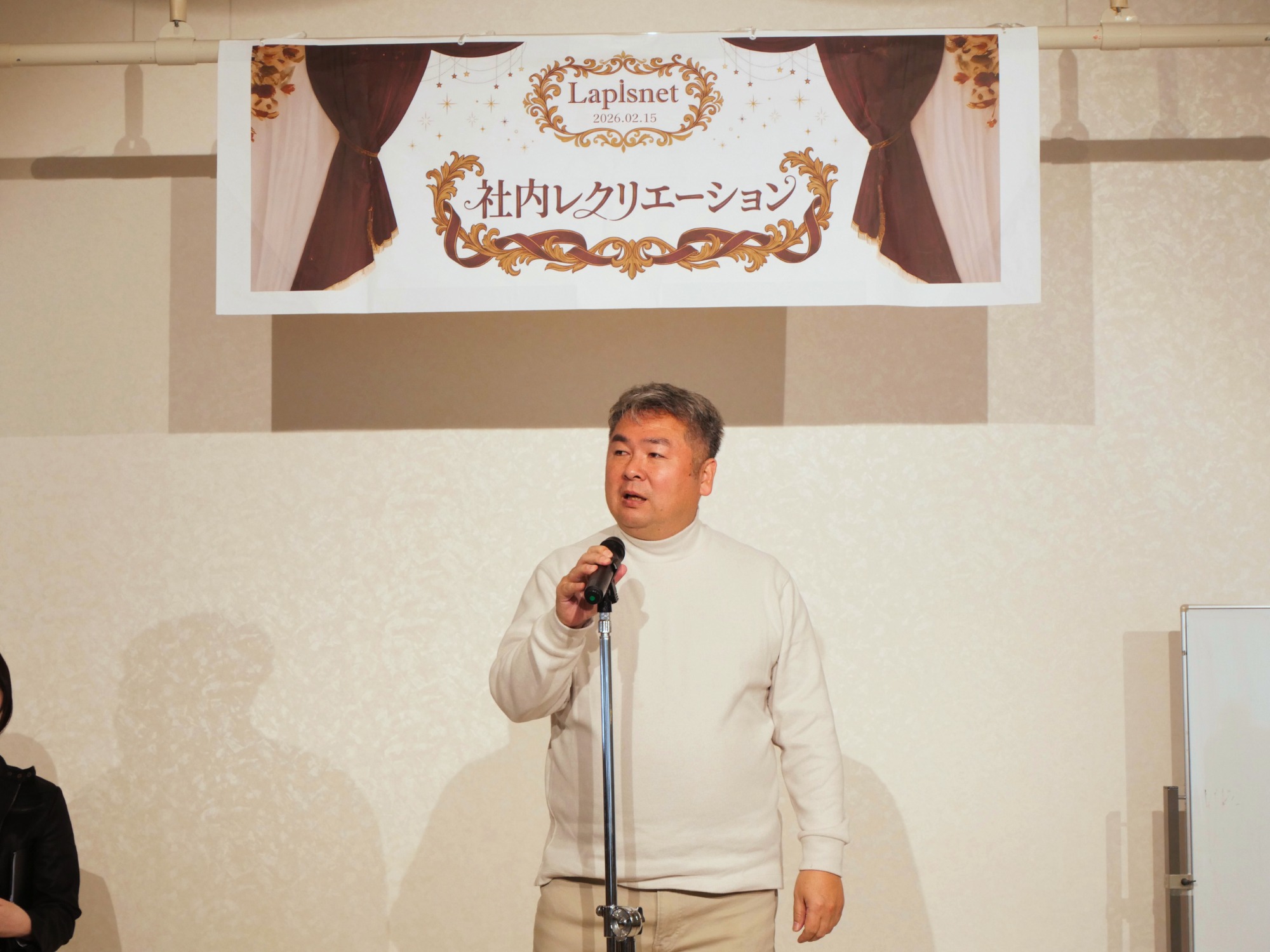 劇場の宴会場で行った貸切パーティーでは、部署の垣根を越えた活発な交流が見られました。普段の業務中とは異なる、ご家族と過ごす社員の和やかな表情が印象的なひとときとなりました。