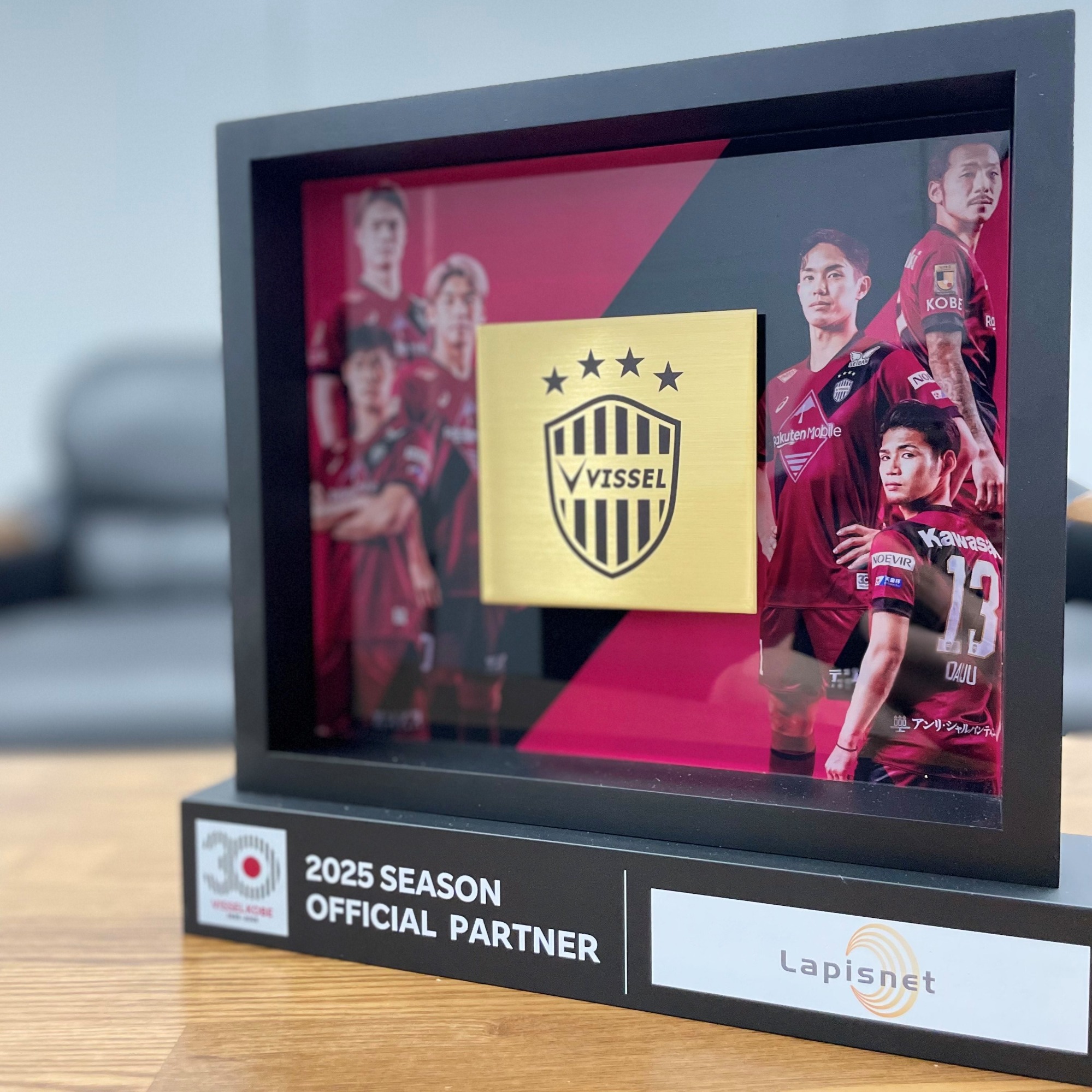 この度、Jリーグの名門クラブであるヴィッセル神戸が、2025年にクラブ創設30周年という輝かしい節目を迎えられましたことを、心よりお祝い申し上げます。オフィシャルパートナーとして、この記念すべき年を共に迎えることができましたことを、大変光栄に存じます。先日、ヴィッセル神戸様より、創設30周年を記念した大変立派な記念盾を拝受いたしました。心のこもった記念品をお贈りいただき、誠にありがとうございます。社員一同、感謝の念に堪えません。この記念すべき30周年という年に、クラブが更なる高みへと飛躍されることを確信しております。Jリーグでの連覇、そしてアジアの頂点を目指すヴィッセル神戸の挑戦を、これからも全力でサポートしてまいる所存です。